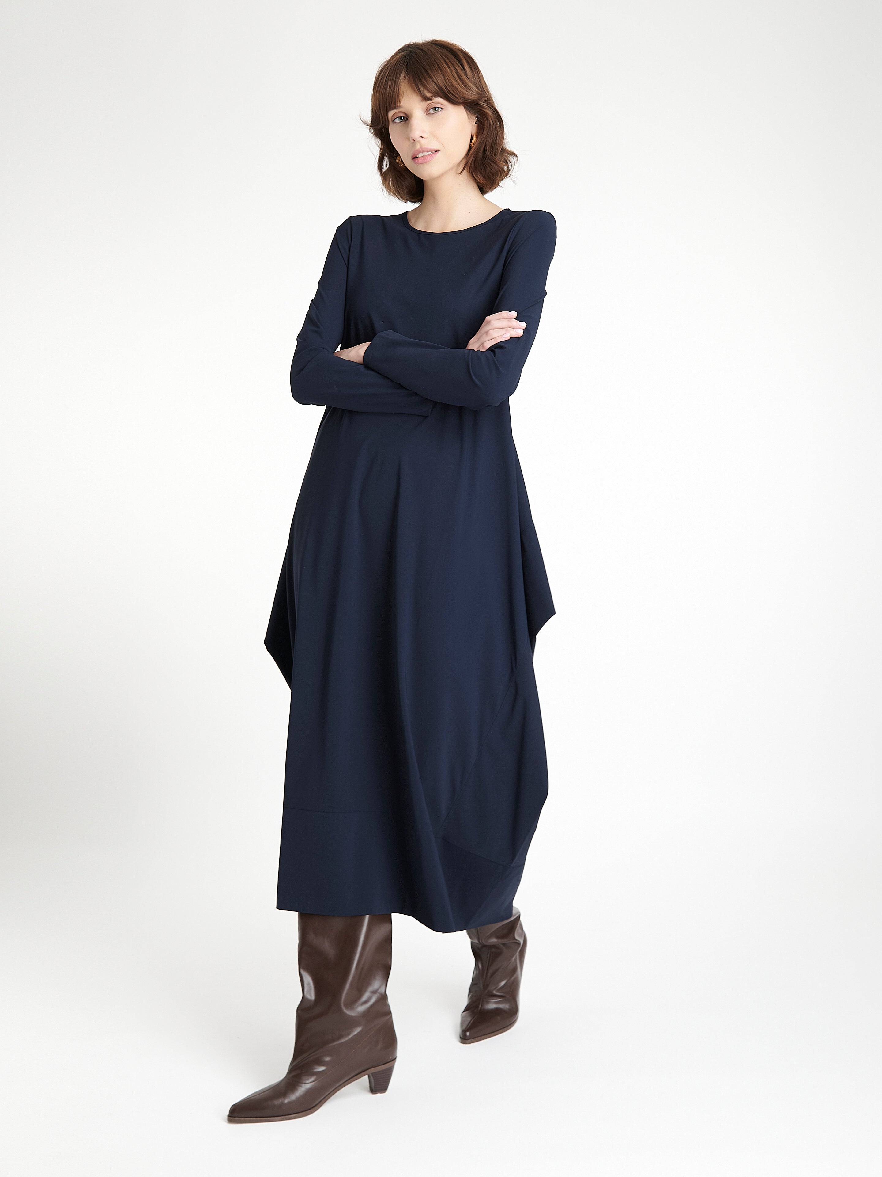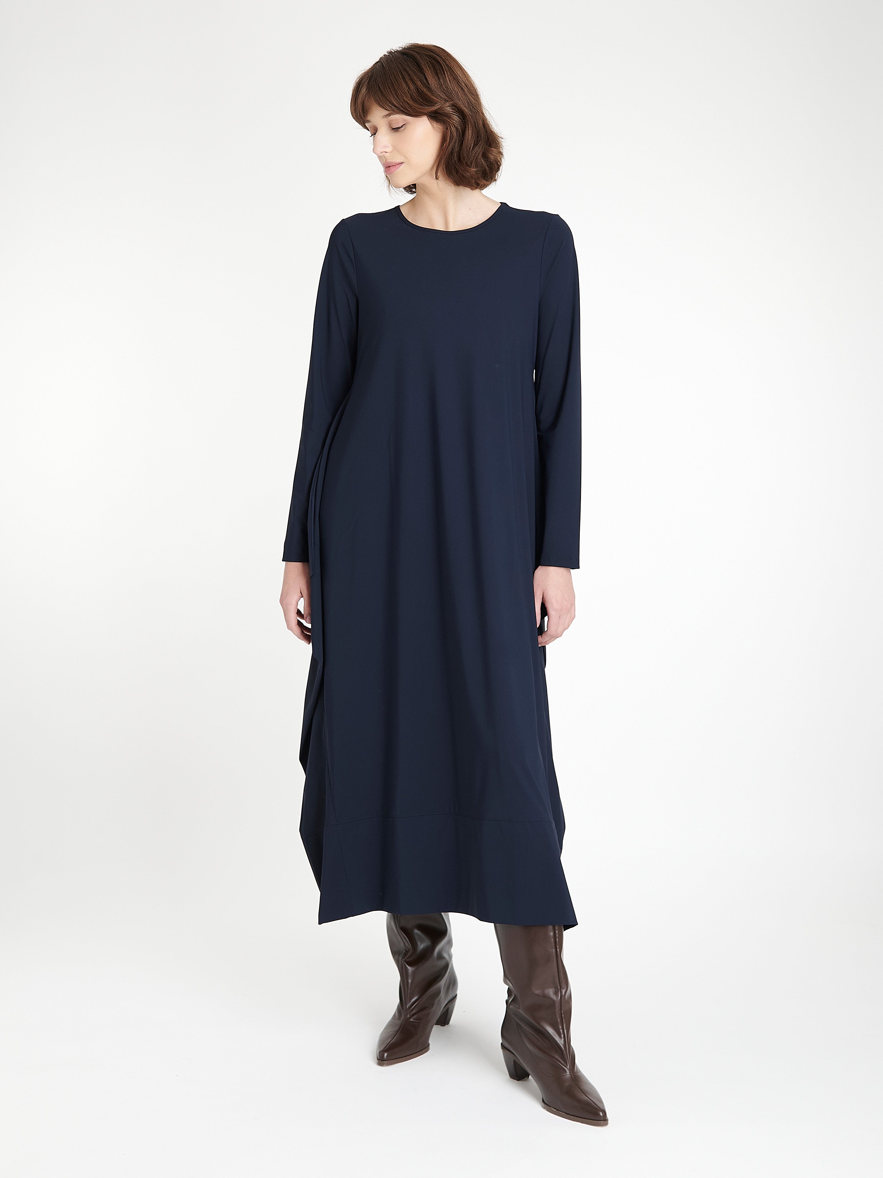 The Isabel Dress LS is an effortlessly chic piece designed for modern elegance. Made from soft technical jersey, it drapes beautifully while providing gentle stretch for comfortable movement. The long-sleeve design features a flowing A-line silhouette with distinctive side drapes, creating a refined and flattering shape. Ideal for both daywear and evening occasions, this dress pairs timeless simplicity with an artistic edge.