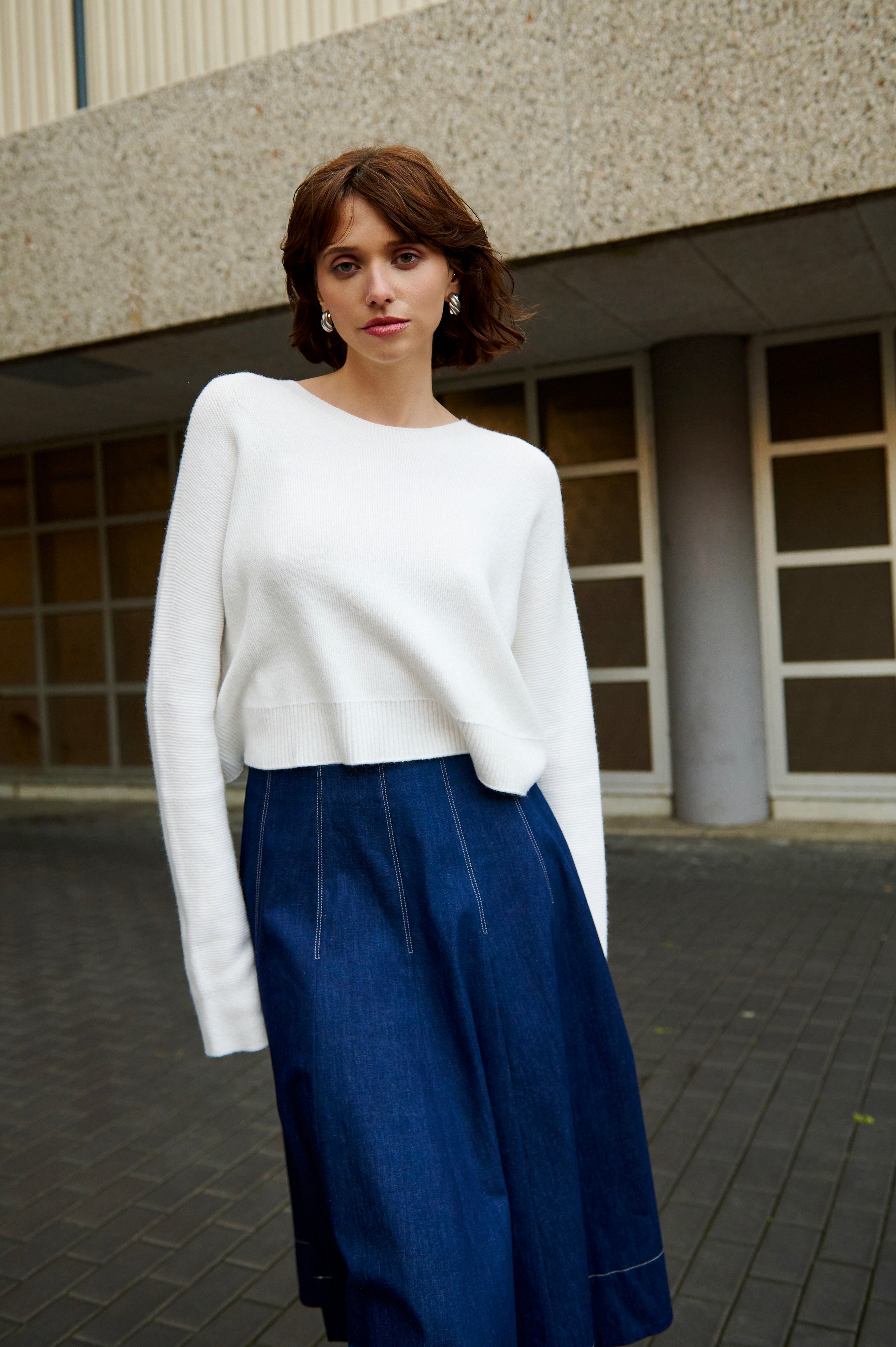 This pullover combines minimal design with maximum comfort. Crafted from a soft viscose blend, the NB2167 stands out with its seamless finish and elegant simplicity. The slightly boxy cut, crew neckline, and clean long sleeves make it perfect for both layering and standalone wear. Its refined silhouette in soft off-white effortlessly complements both skirts and tailored trousers.