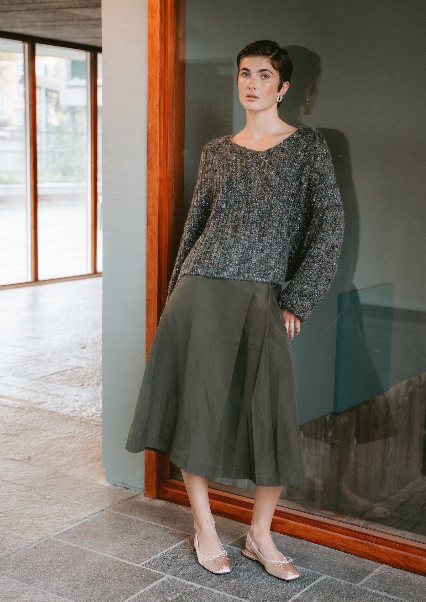 The Pullover shiny alpaca H24423 is an elegant knit that merges cozy comfort with a subtle sheen. Crafted in a soft and lightweight blend, this pullover stands out with its fine texture and versatile silhouette. The simple, round neckline and straight fit make it an ideal choice for effortless layering or standalone sophistication.