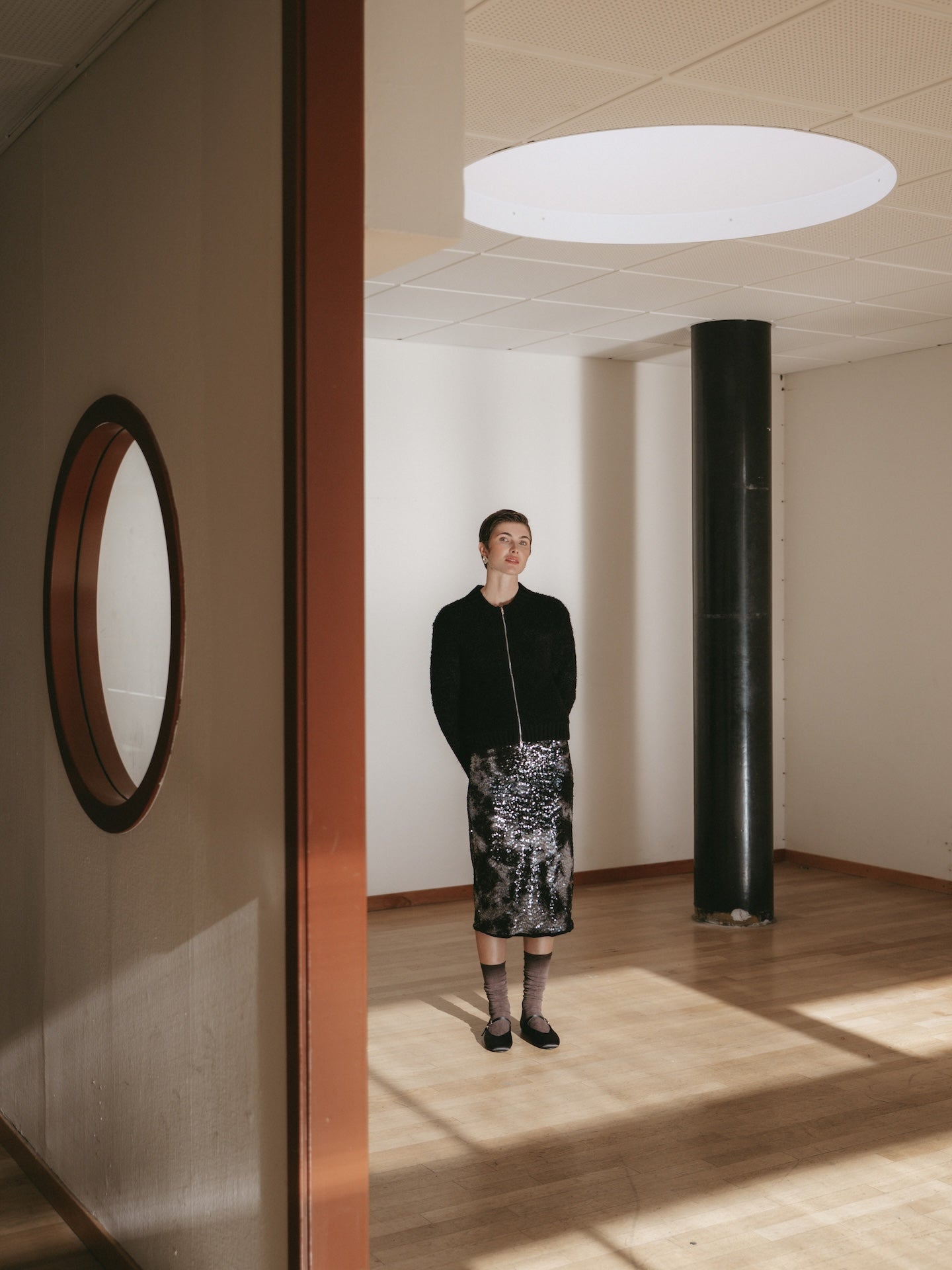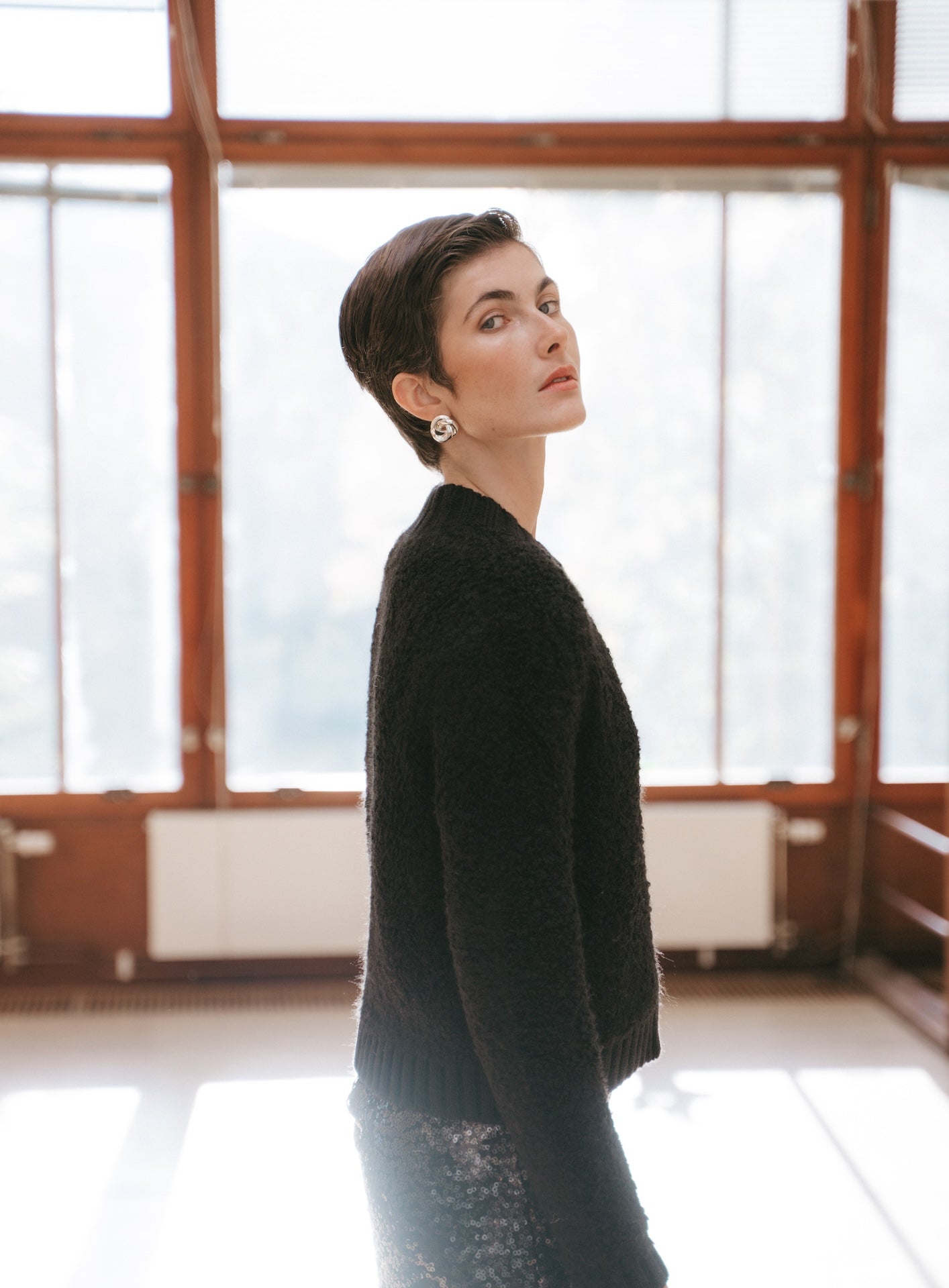 A refined knitted top that combines delicate craftsmanship with a modern edge. Featuring an openwork pattern enriched with subtle sequins, this piece adds understated sparkle to your wardrobe. The half sleeves and soft round neckline make it perfect for layering or wearing solo.
