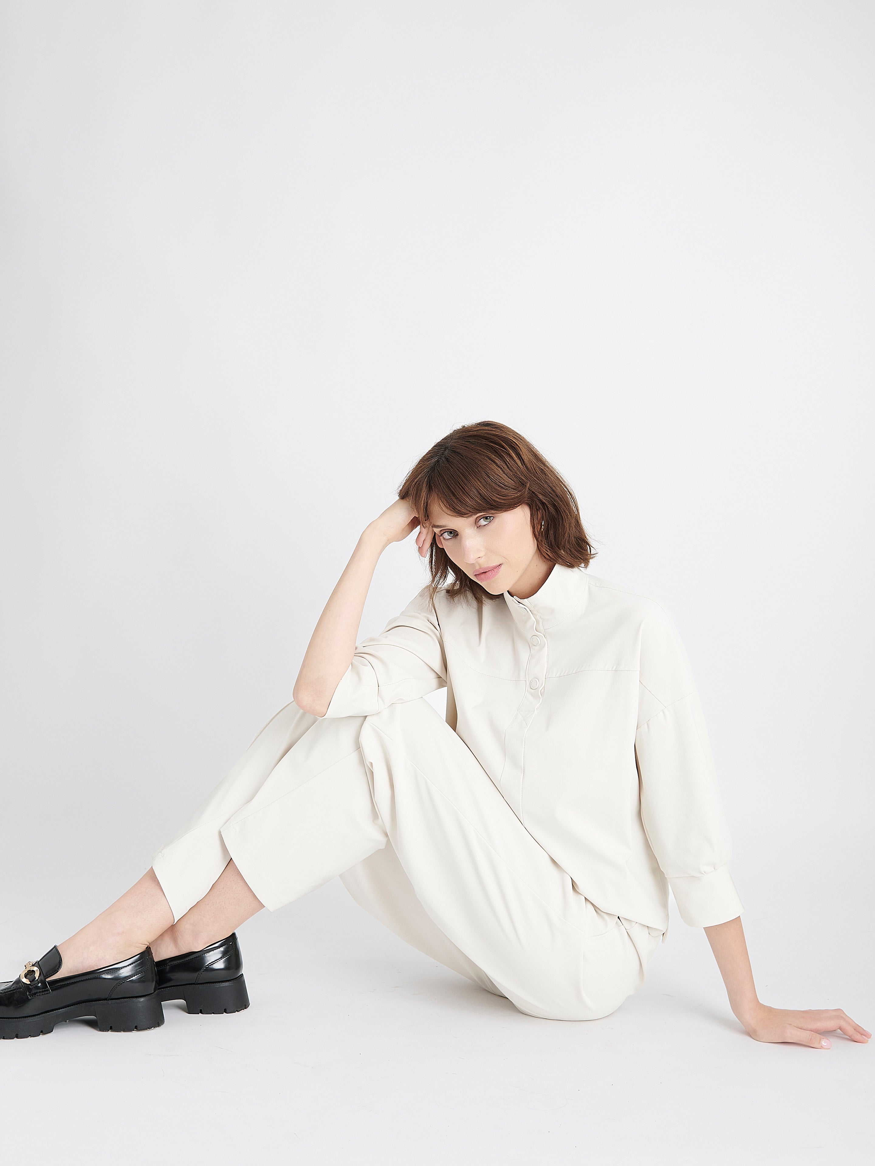 With a distinctive structured design, the Angelika top blends sporty elements with polished elegance. Crafted from soft technical jersey with a brushed suede-like finish, this top stands out with its modern funnel neck and sleek snap-button placket. The ¾ sleeves and minimalist silhouette make it a refined layering piece for colder days or a bold standalone statement.