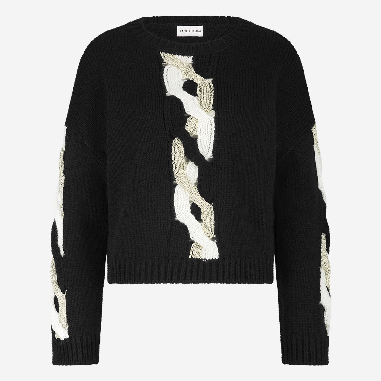 Make a shimmering statement with the Pullover gold print NB2404 by Jane Lushka. Designed in a relaxed fit with a wide turtleneck and elbow-length sleeves, this knitwear piece is elevated with bold golden stripes on the front, bringing a festive and fashionable flair. The soft handle and boxy silhouette make it ideal for layering with both casual and dressed-up looks.