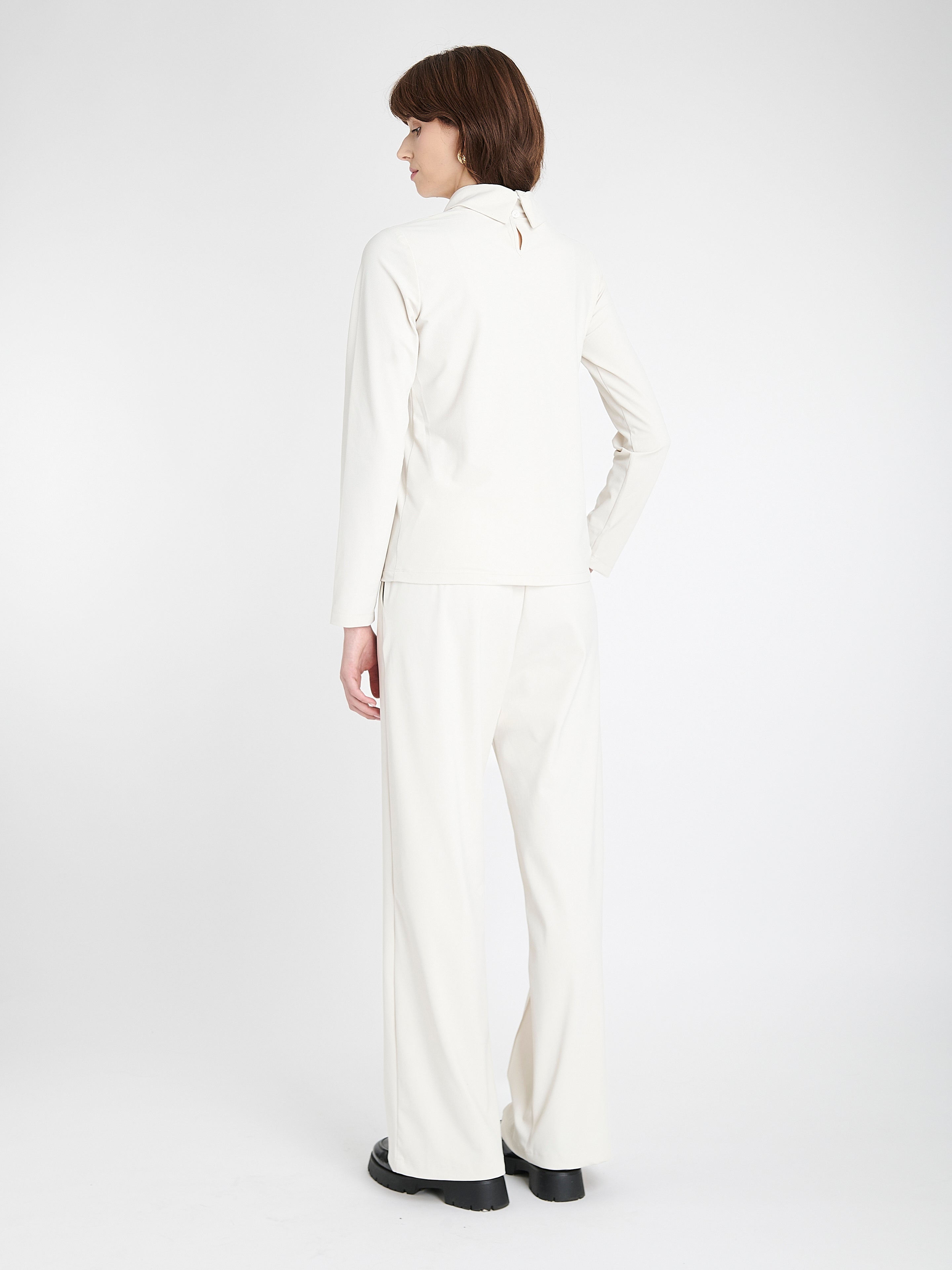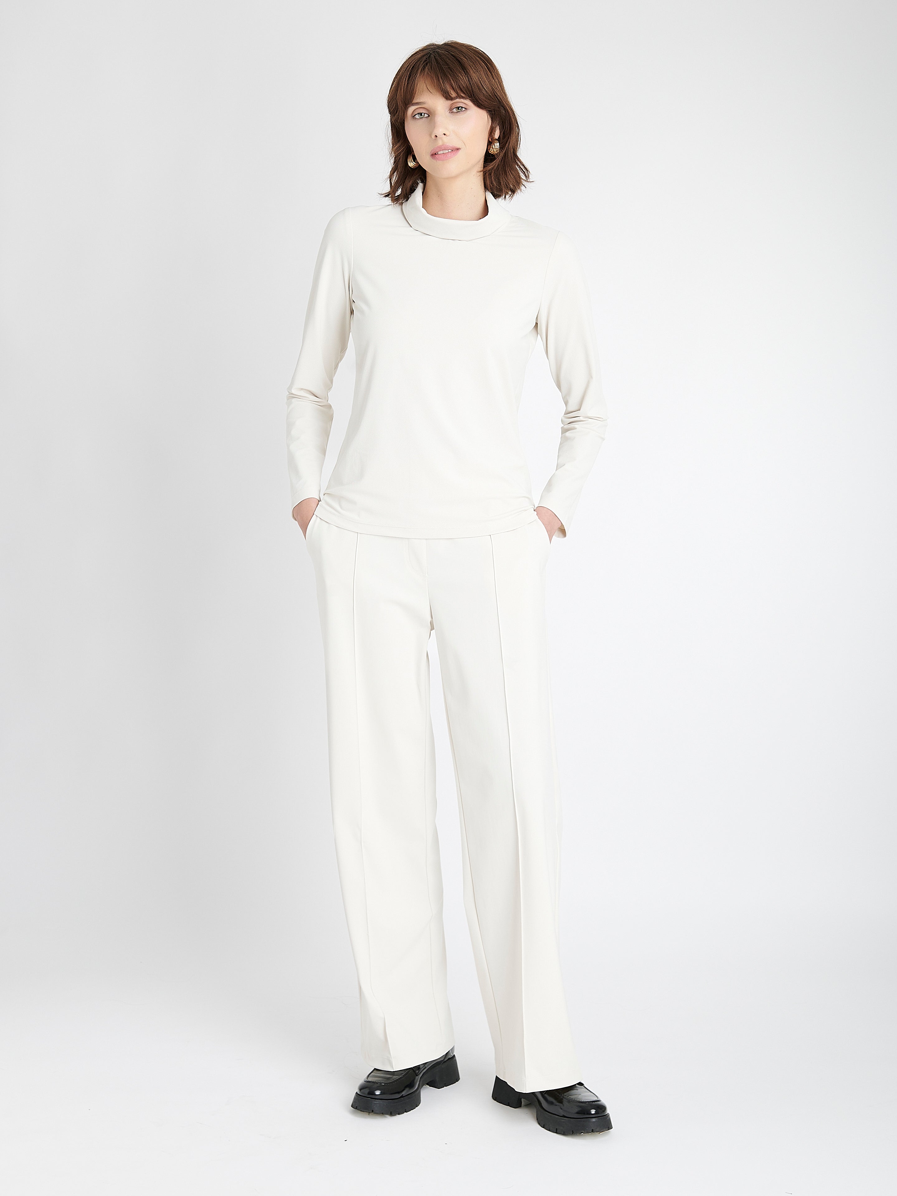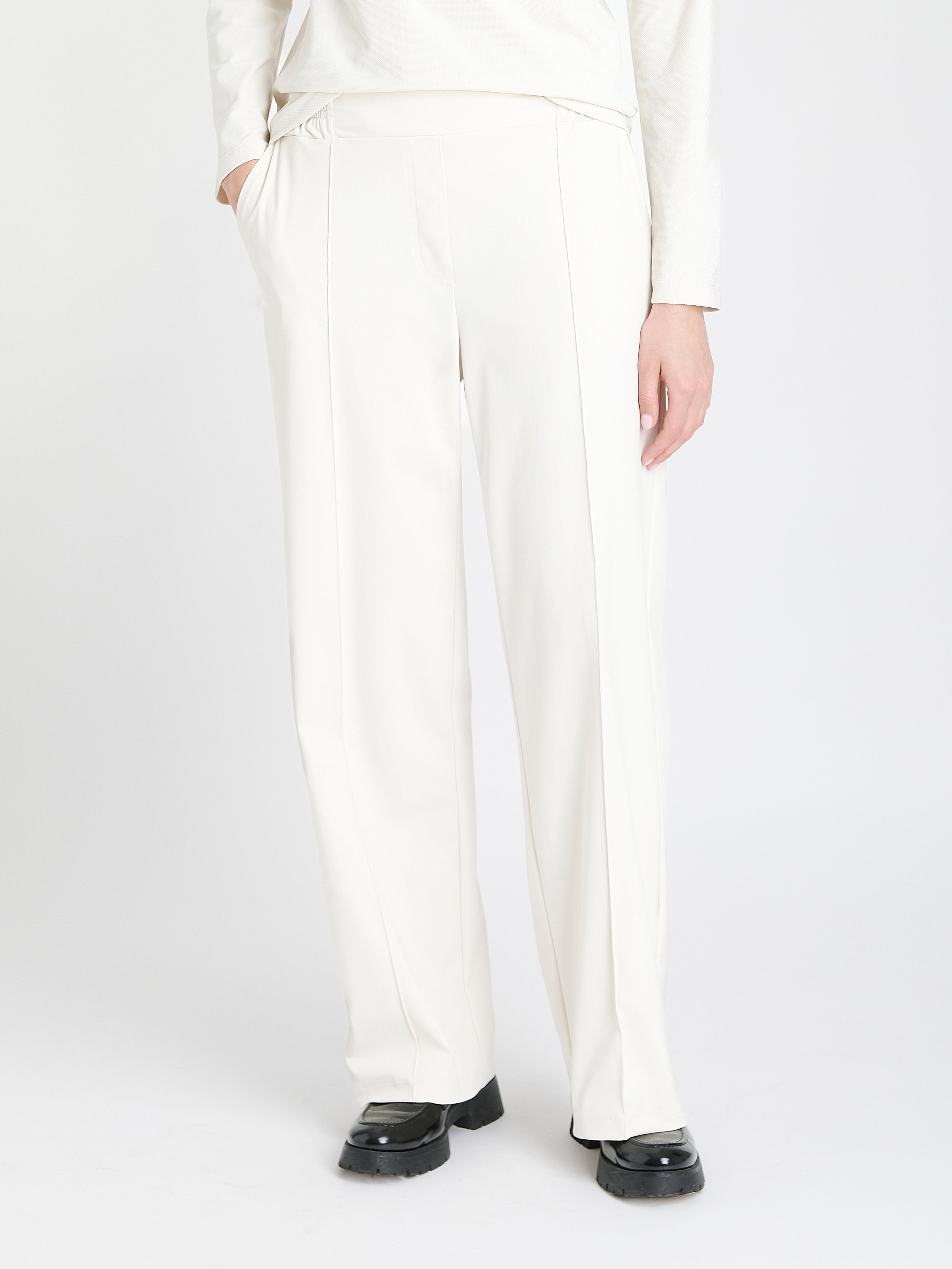 Elegant and functional, the Thera Pants offer a streamlined silhouette with tailored details. Crafted from brushed technical jersey, they feel soft against the skin and provide subtle structure. The wide-leg design and pressed creases create a polished look, while the mid-rise waistband ensures everyday comfort — perfect for both office and formal occasions.