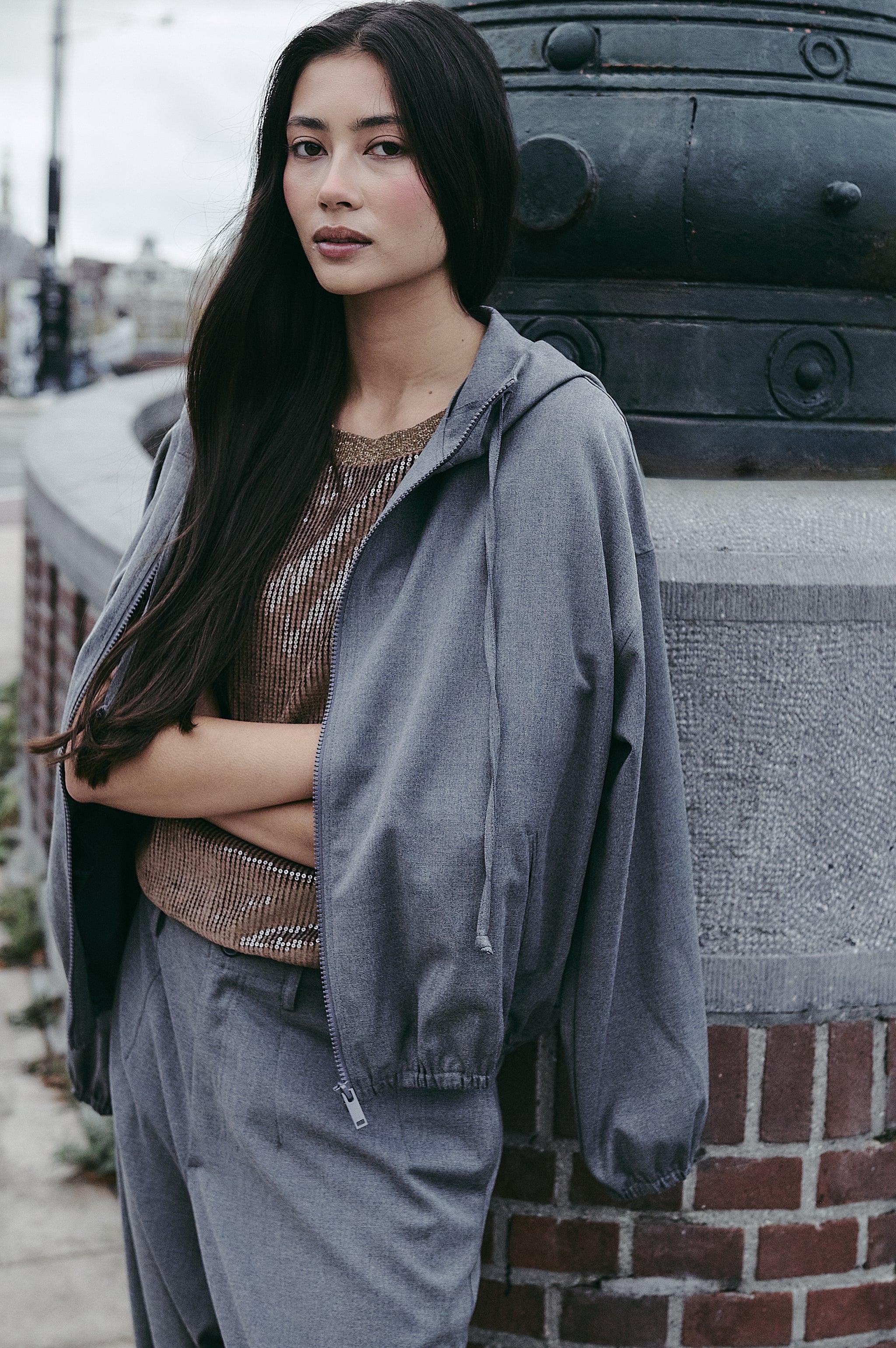 The Misi viscose jacket (SMS125129) offers a perfect balance between sporty ease and modern elegance. Crafted from a fluid yet structured blend of polyester, viscose, and elastane, this hooded jacket brings casual refinement to your wardrobe. Designed with a loose silhouette, elastic cuffs, and front zipper, it’s an ideal piece for layering during cooler days. Whether styled with tailored trousers or soft knits, Misi brings understated versatility.