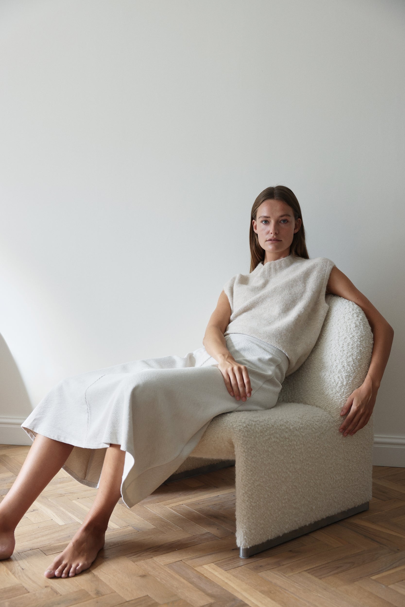 Elegant in its simplicity, the Heide Dress features a sleeveless silhouette with a round neckline and soft pleats that fall gracefully from the waist. Crafted from technical jersey, it offers fluid movement and everyday comfort while retaining a refined structure. The midi length and timeless shape make it perfect for both casual sophistication and elevated layering.