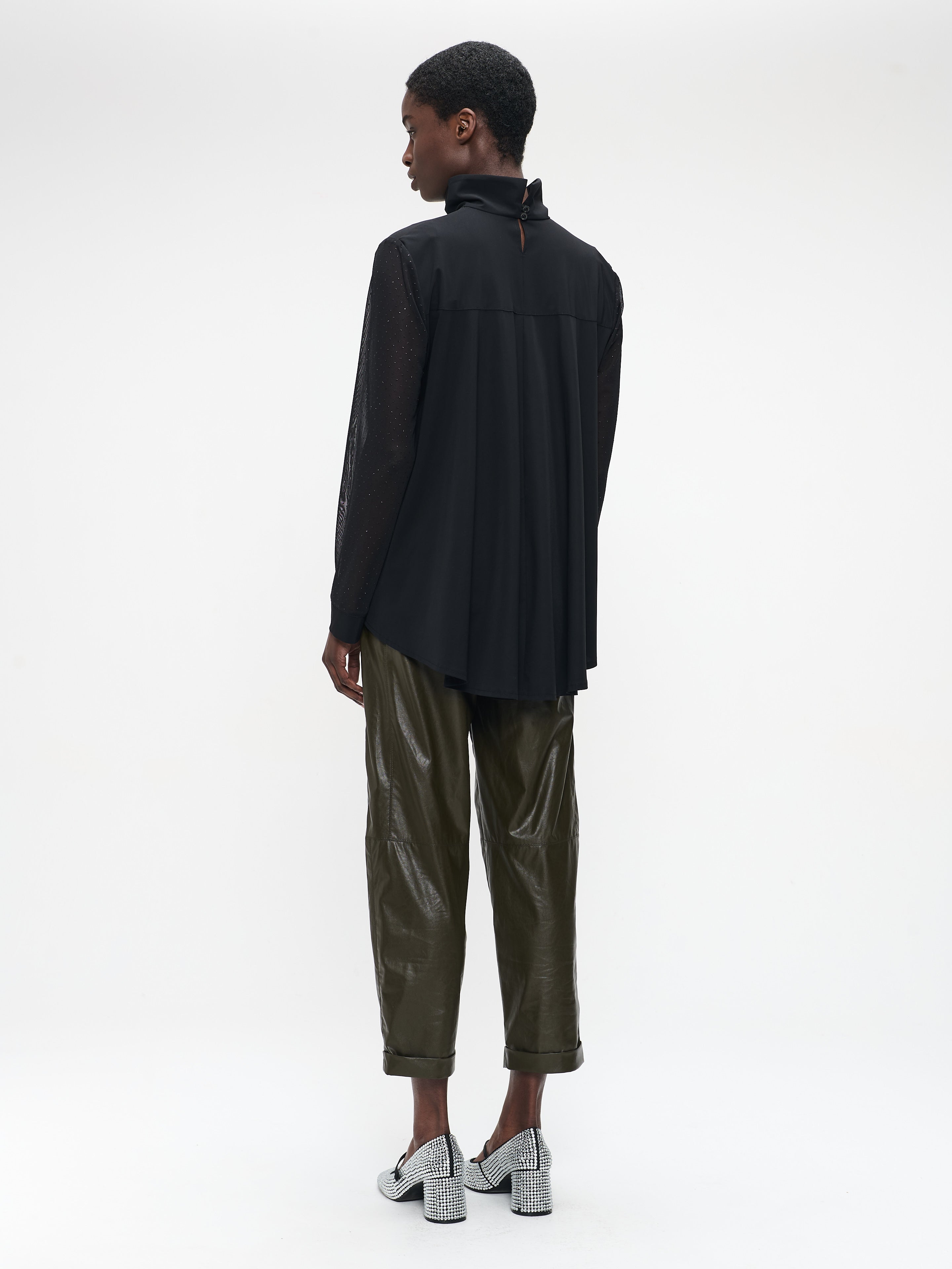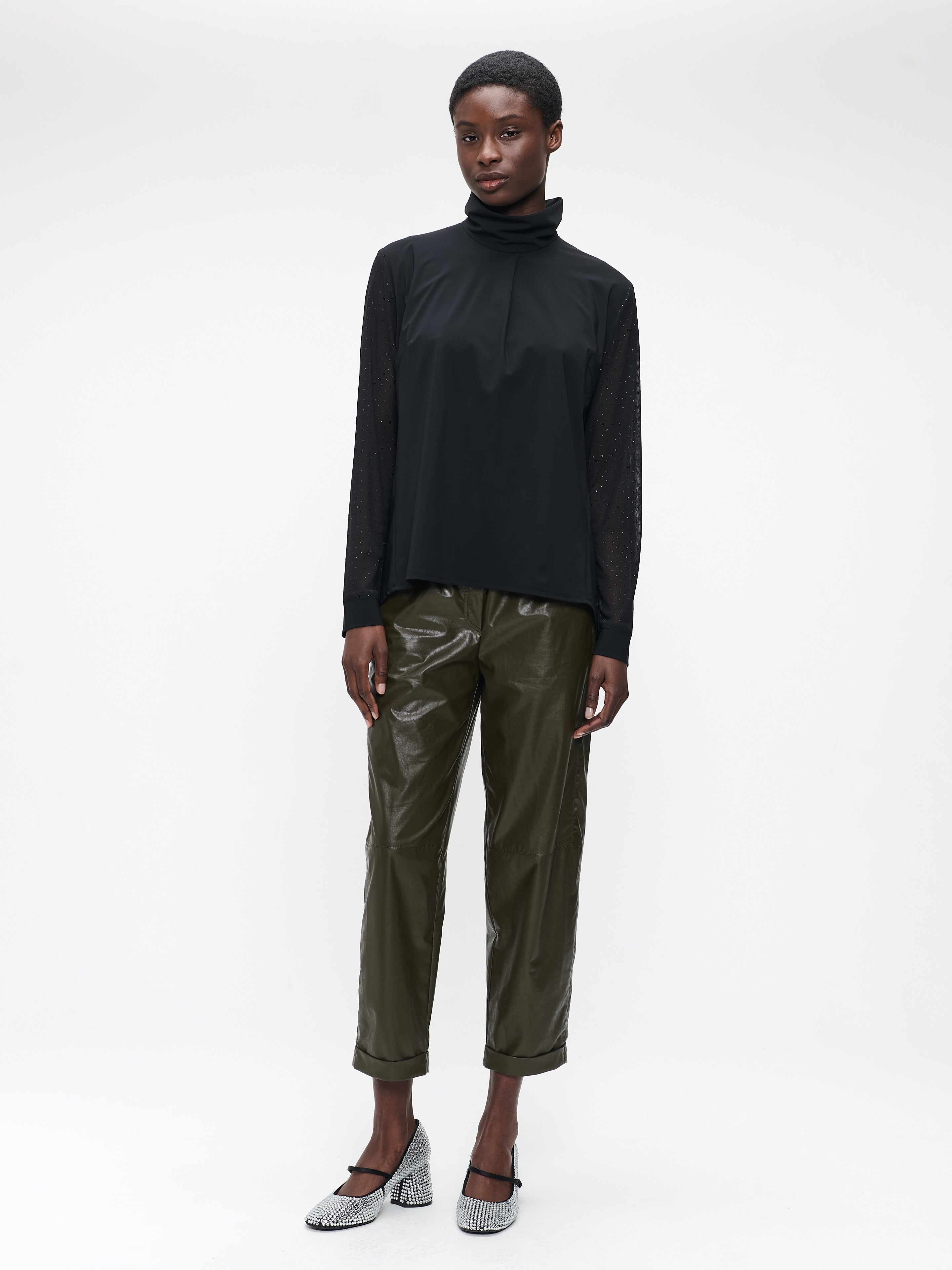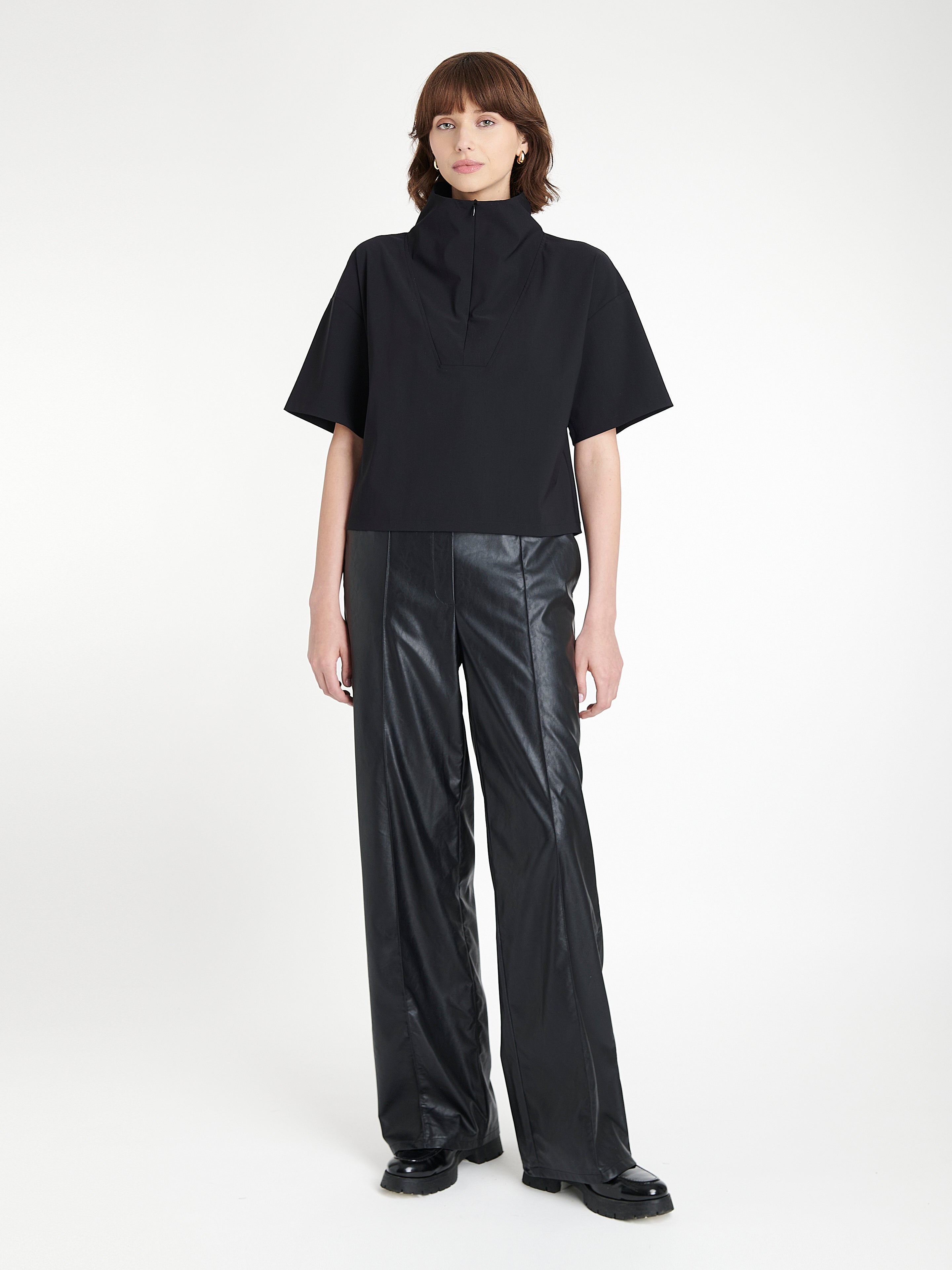 Zara Top, crafted from high-tech jersey. Featuring a semi-raised neckline, this top offers a sleek and modern look, perfect for both professional and casual settings. Its innovative fabric ensures comfort and style all day long.