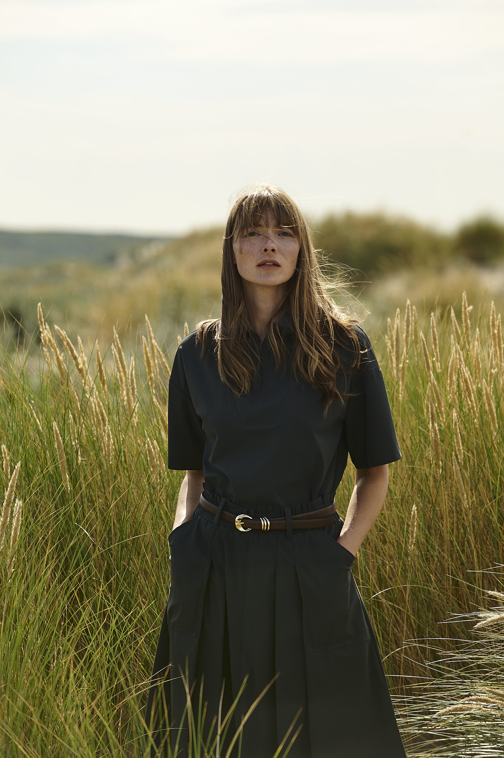 The Leone Blouse offers an elevated everyday essential with a touch of structure and sophistication. Made from soft technical jersey with a suede-like brushed finish, this blouse stands out with its architectural collar and clean silhouette. The relaxed shape and dropped shoulders provide comfort, while the sculptural neckline adds polish—perfect for both work and leisure.