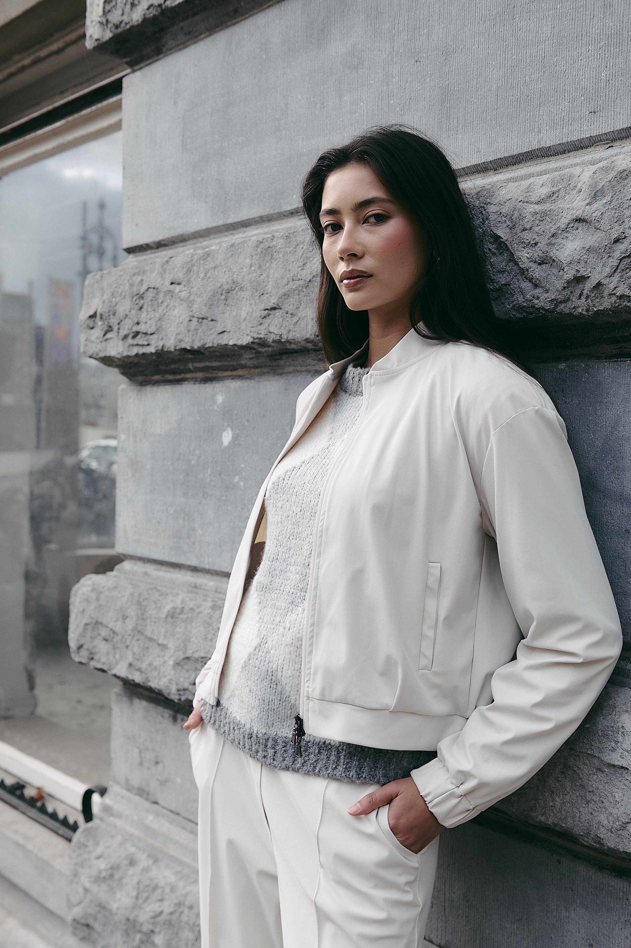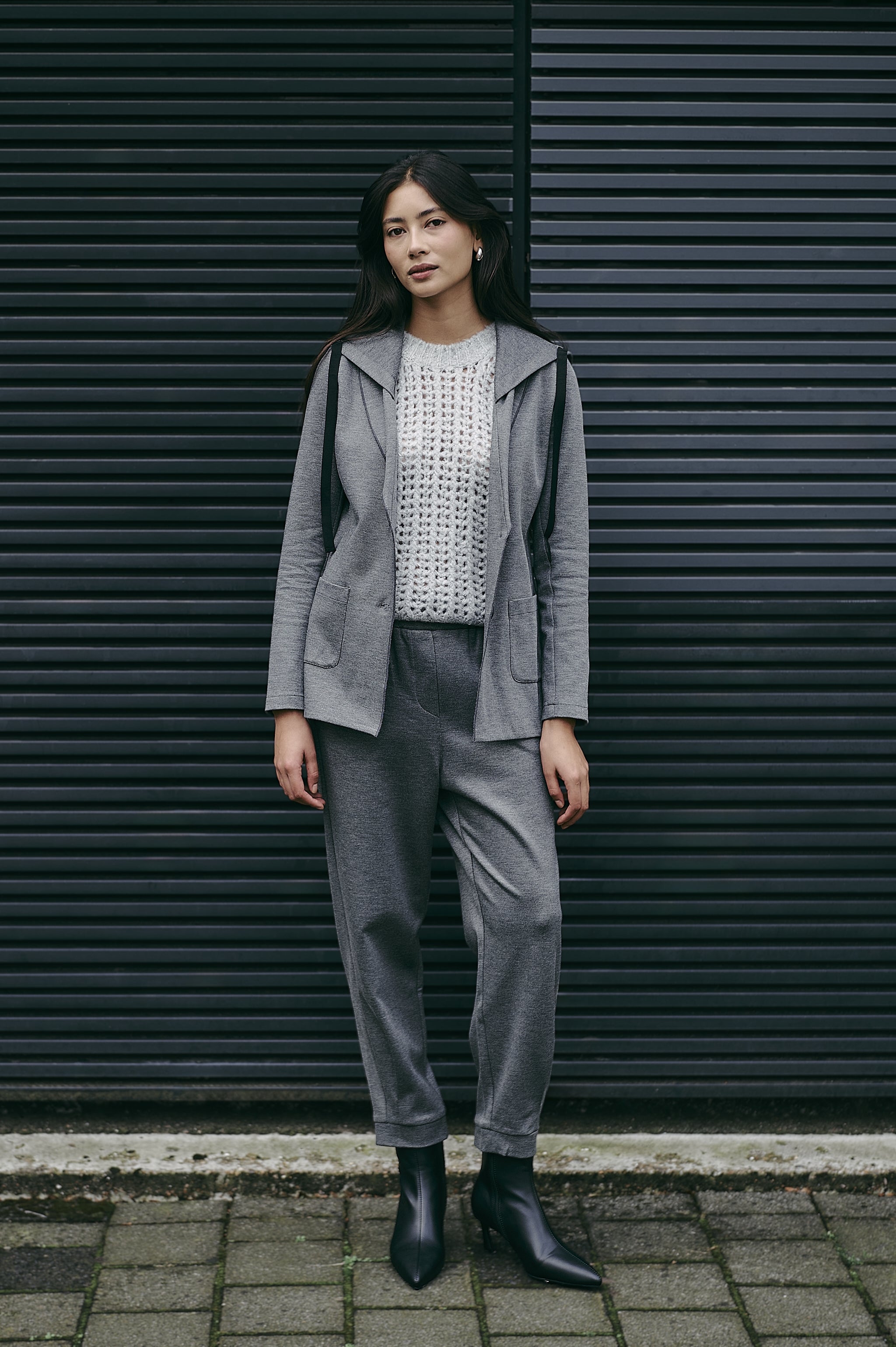 The Timelia Pants blend modern structure with cozy appeal. Cut from a soft technical jersey with suede-like texture, they feature a tapered leg and cuffed hems for a sleek yet relaxed silhouette. Ideal for cooler seasons, they offer both style and ease — perfect for pairing with matching tops or chunky knits.