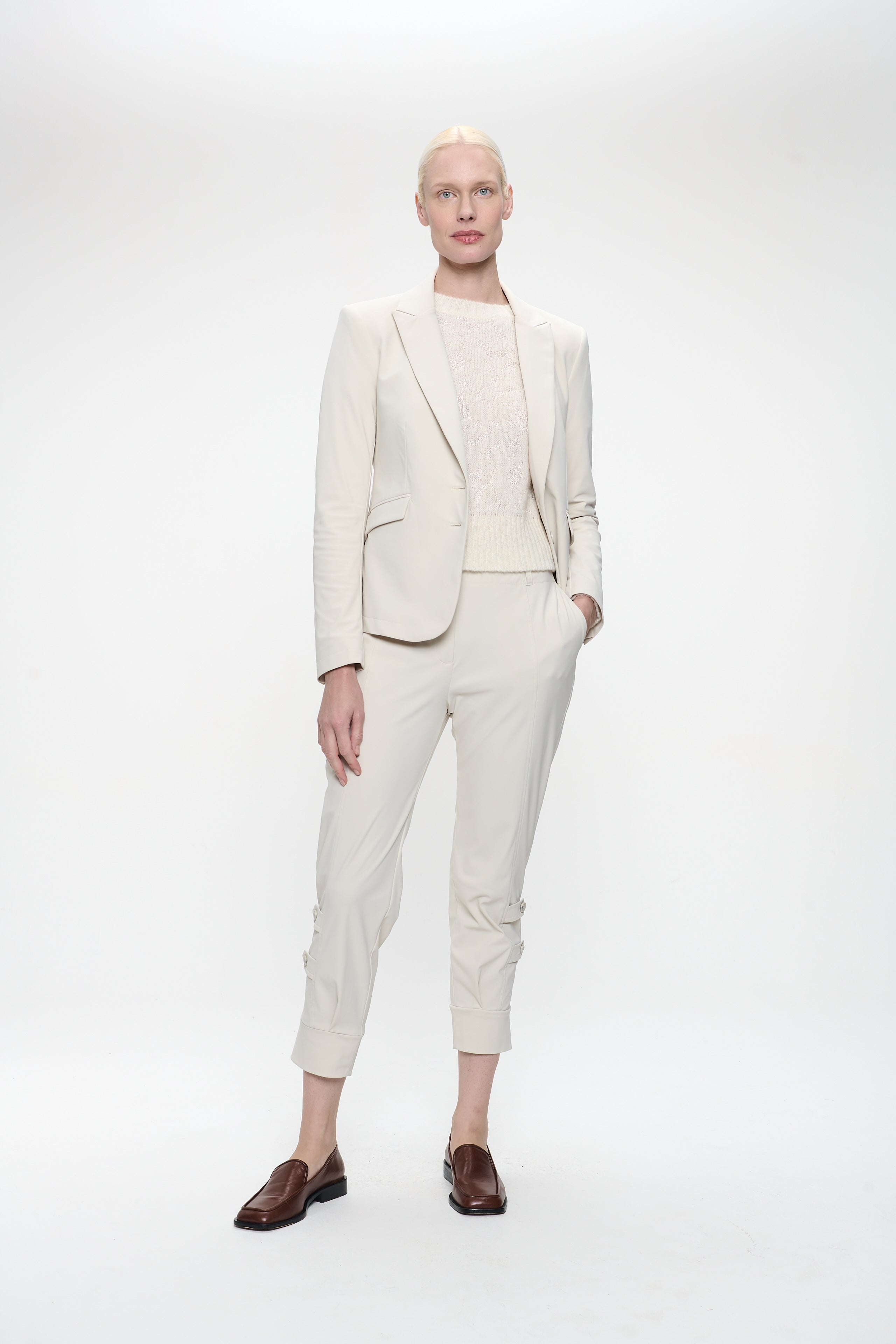 The Delia Pants strike the perfect balance between elegance and comfort. Made from brushed tech jersey with a suede-like touch, they feature cropped tapered legs finished with decorative buttoned cuffs. Their refined silhouette makes them a versatile wardrobe staple, ideal for work, travel, or evening looks.
