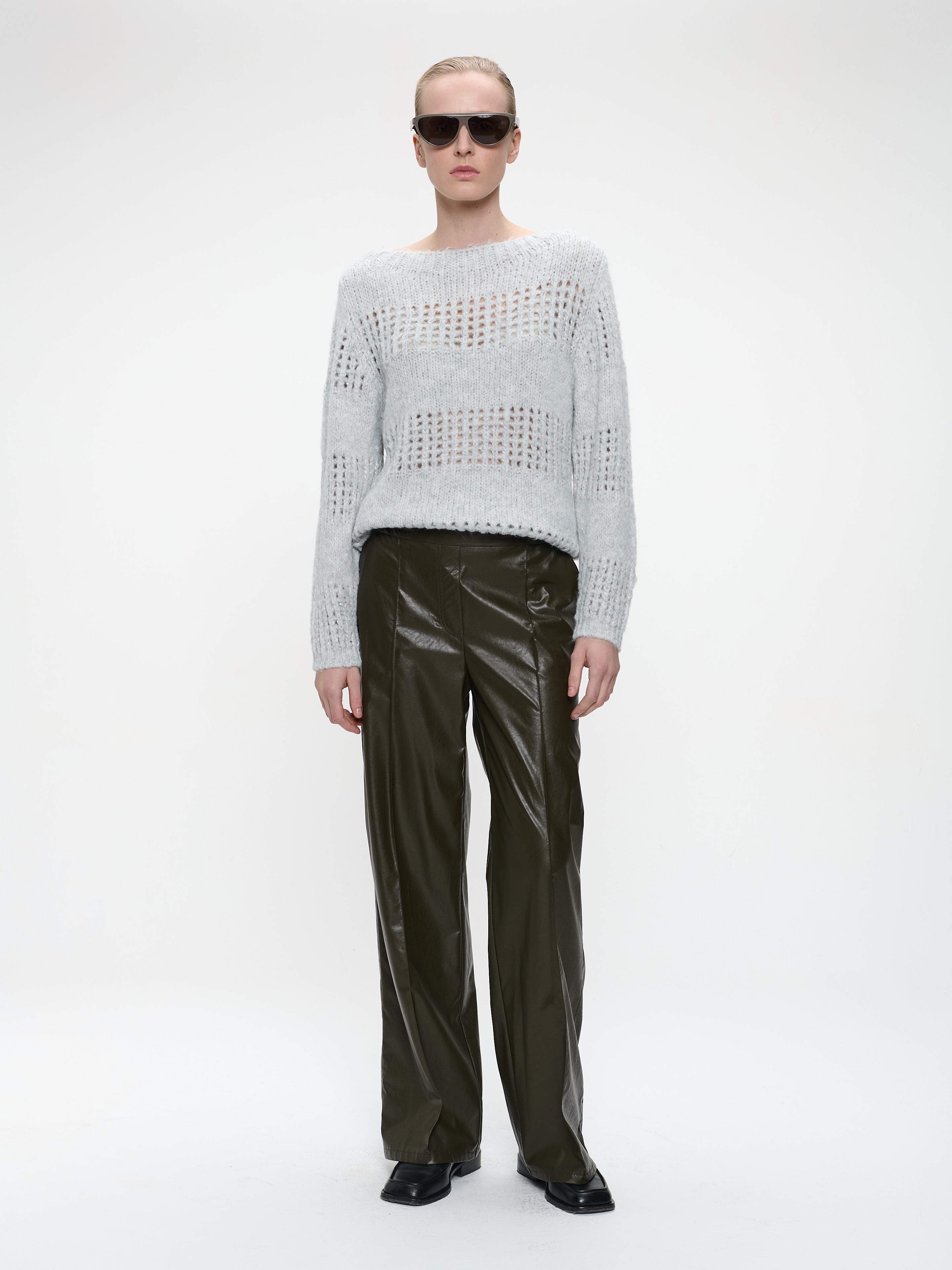 Shiny Pullover 1034 brings a unique twist to everyday knitwear with its semi-sheer open-knit structure and subtly shimmering yarns. The pullover combines a boxy silhouette with a slightly shorter length, making it a great match for both high-waisted trousers and skirts. Its soft off-white shade adds a clean and cozy finish to your seasonal wardrobe.