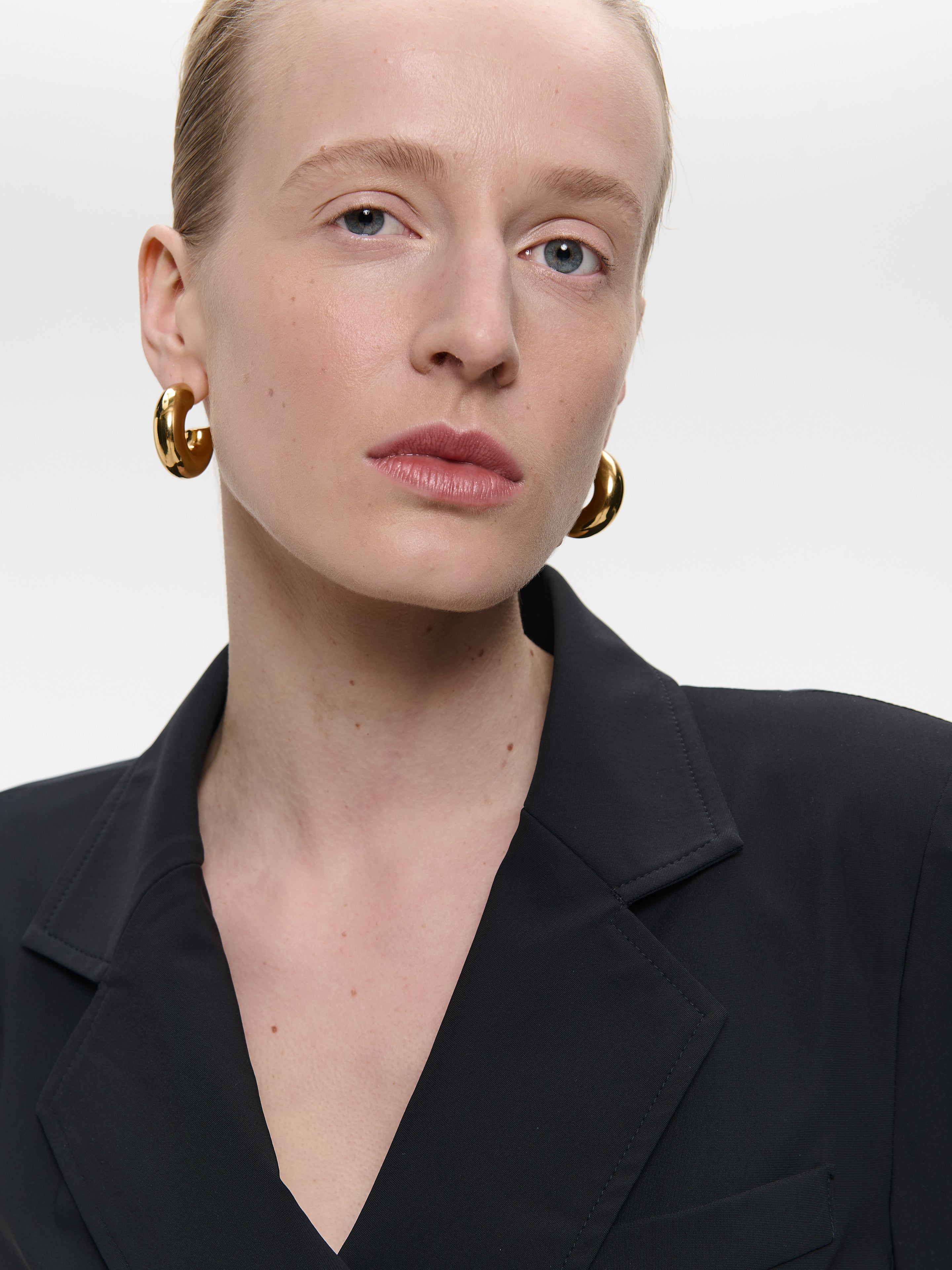 Combining sharp tailoring with feminine elegance, the Hella Dress reimagines the classic blazer silhouette into a bold, structured piece. Crafted from technical jersey, it features a double-breasted front and contrasting white cuffs that enhance its refined aesthetic. The slightly flared hemline adds movement and softens the structured look — ideal for both boardroom confidence and evening sophistication.