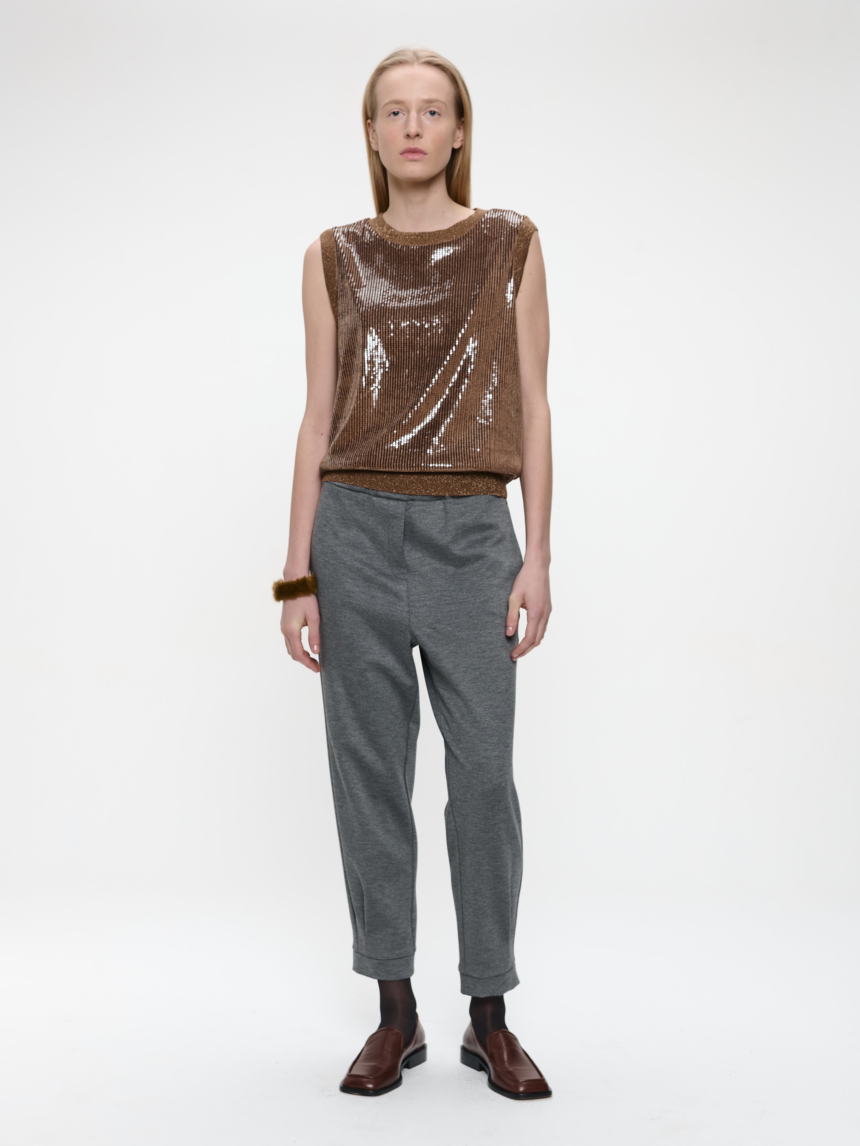 Elevate your eveningwear with the Pallino Sequins Top – a dazzling statement piece that captures the essence of festive elegance. Crafted from recycled materials and adorned with a shimmering silver sequin finish, this sleeveless top effortlessly merges sustainability and style. Its classic silhouette with rolled cuffs and soft round neckline ensures a flattering fit that’s both chic and comfortable.